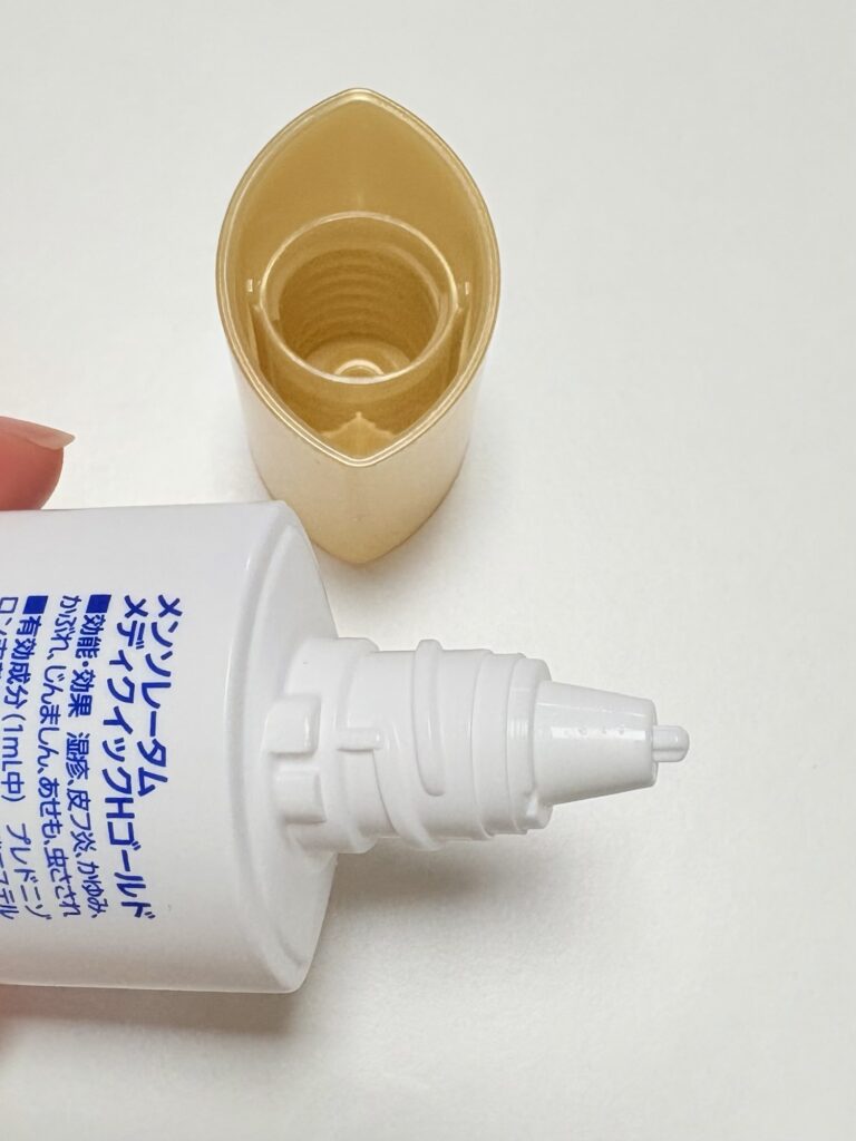 キャップは回転式で閉まります。で、先端が細くなっているのでピンポイントで痒いところに届きます。私は頭皮湿疹?ポコっとなって痒いところにダイレクトに塗っています。手も汚れません。